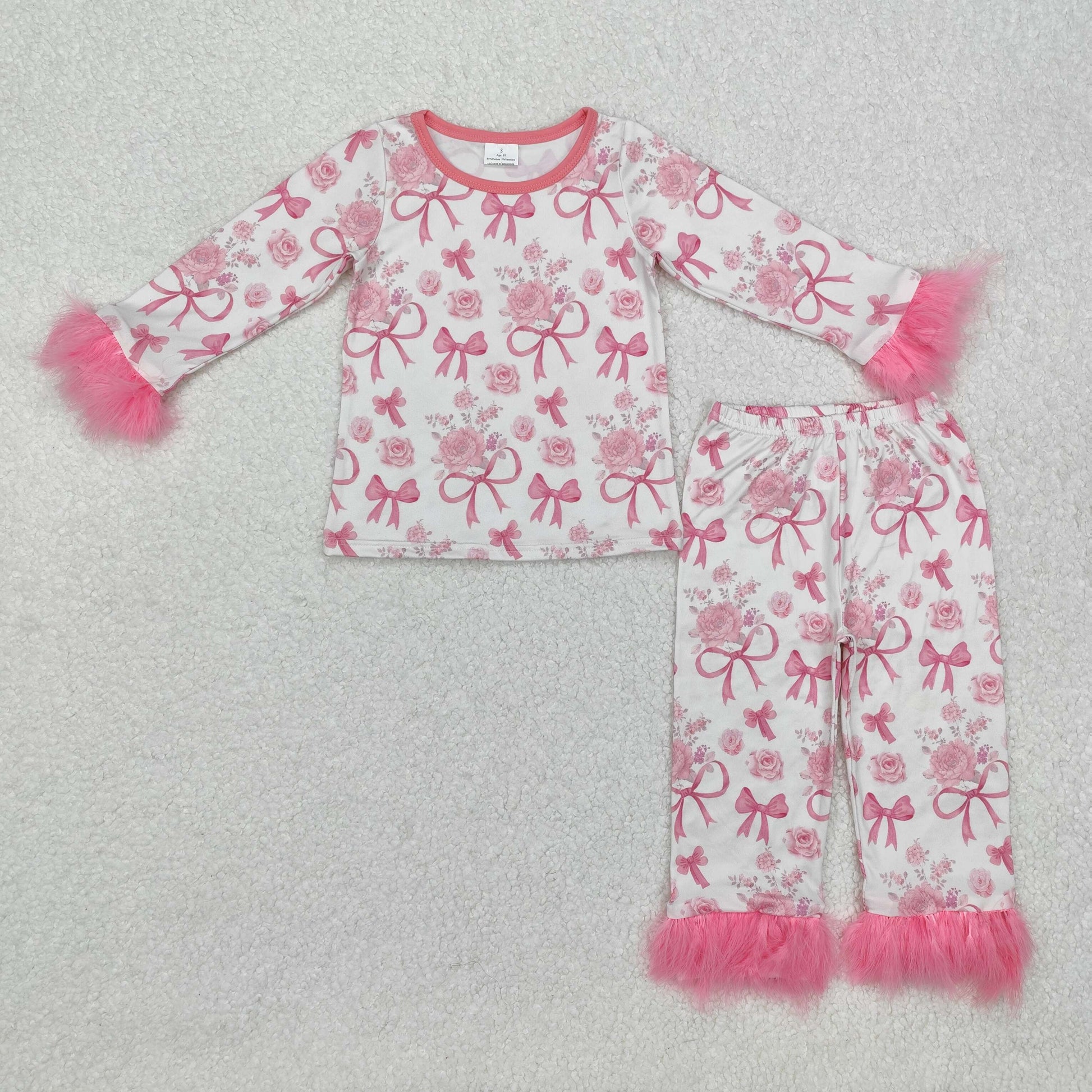 RTS NO MOQ ETA 5/7days arrived GLP2215 Flower bow pattern pink plush edge beige long sleeve long pants pajama set