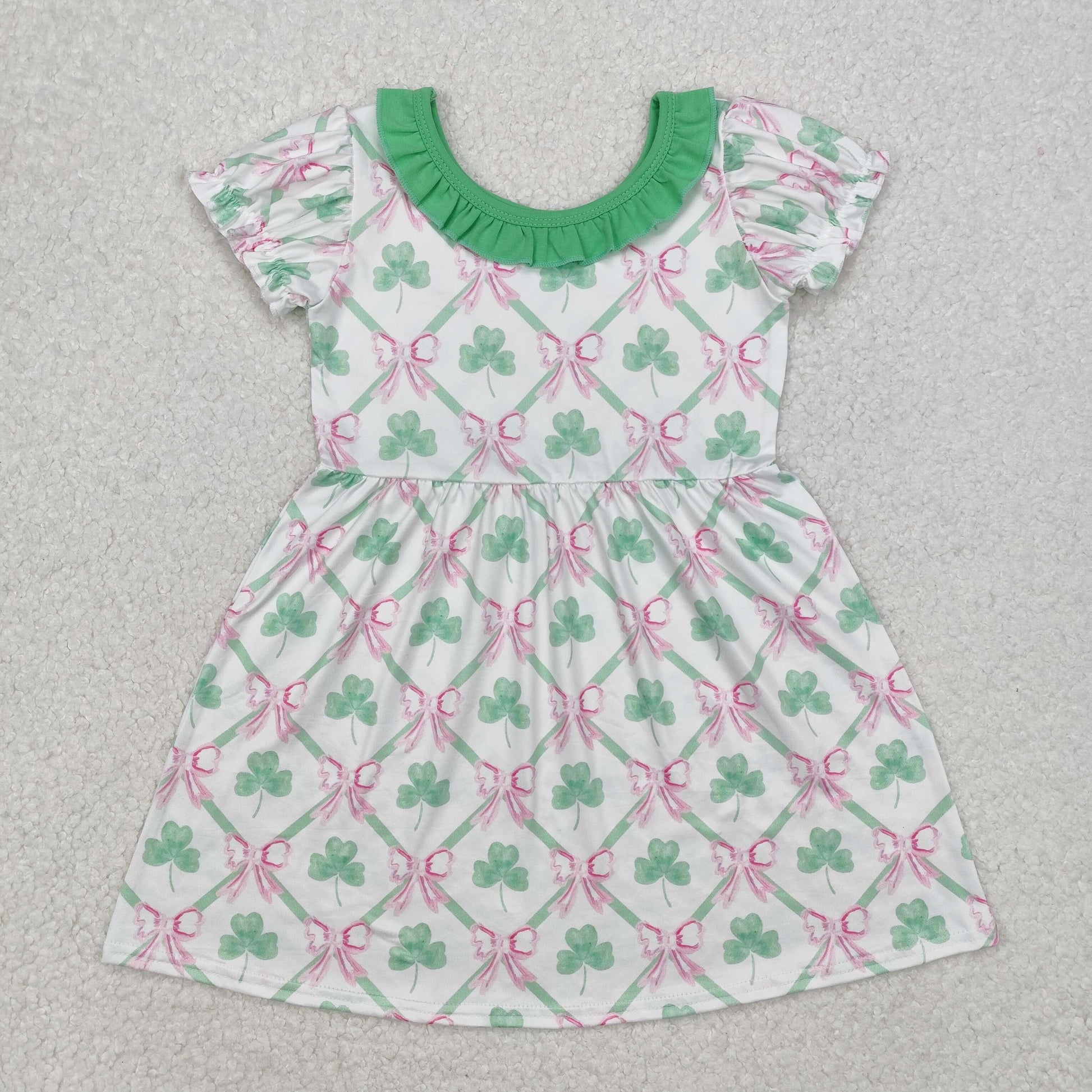 RTS NO MOQ ETA 5/7days Arrived GSD1493 White short-sleeved dress with four-leaf clover bow pattern green lace