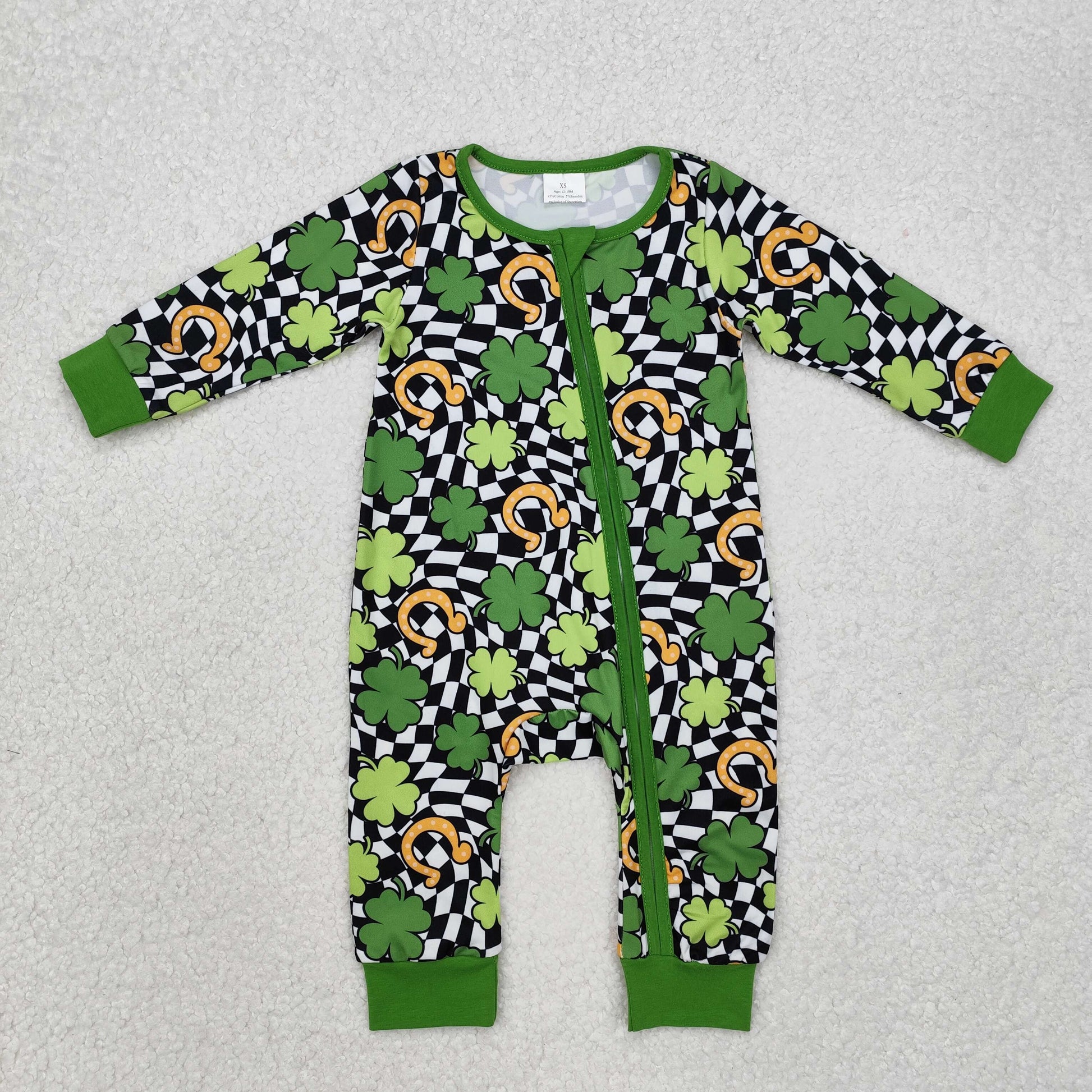 RTS NO MOQ ETA 5/7days arrived LR2090 Four-leaf clover black and white plaid zipper long-sleeved jumpsuit