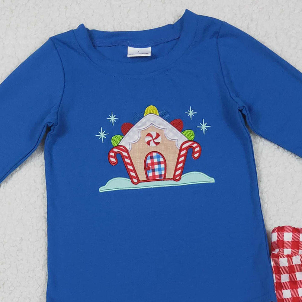 RTS NO MOQ (In stock)BLP1151 Baby Boys Winter Outfits Embroidery Christmas Candy Cane Print Long Sleeve Top with Pockets Red Plaid Pants Two-Piece Outfit Set