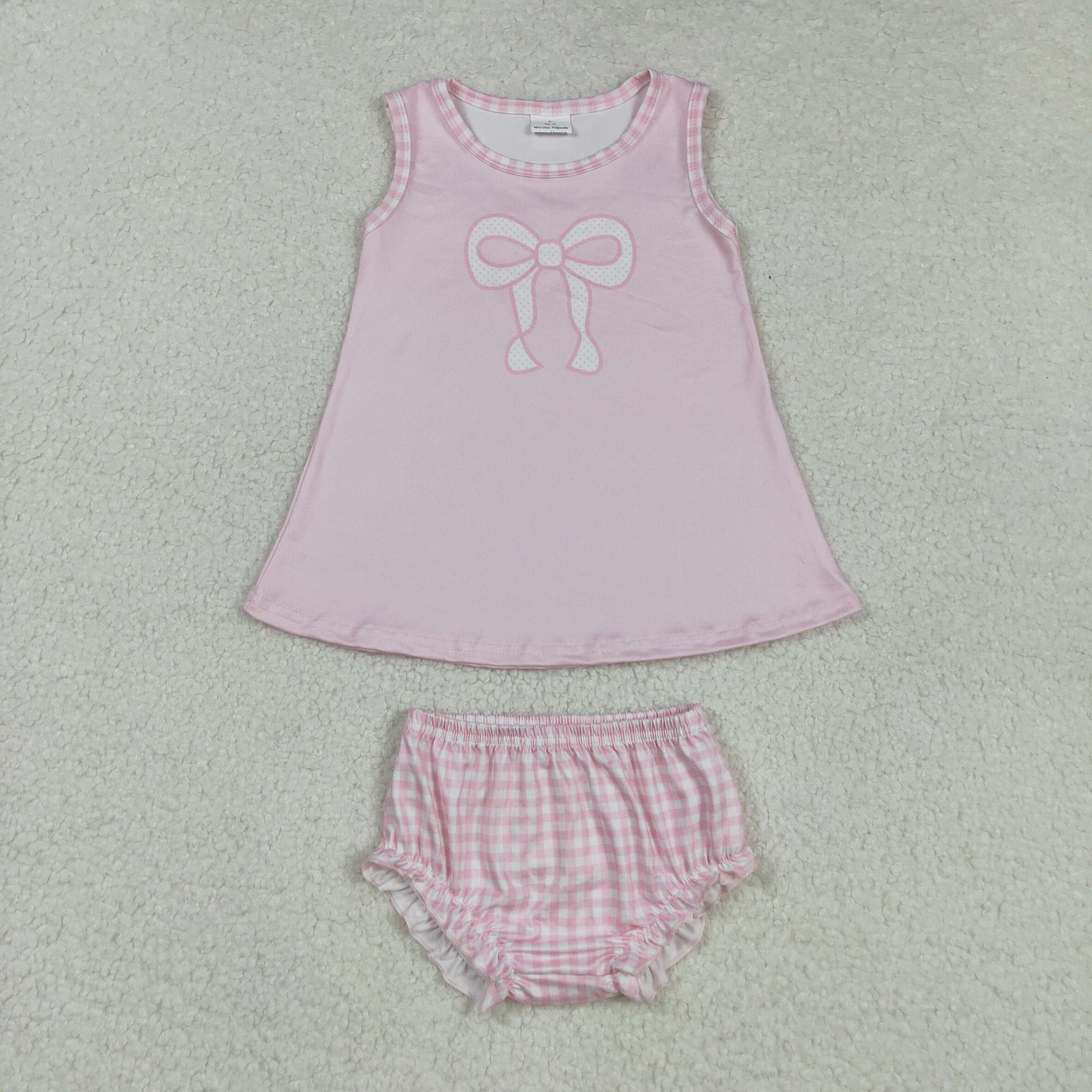 RTS NO MOQ (In stock)GBO0469 Baby Girls Summer Outfits Baby Girls Light Pink Sleeveless Bow Tunic Bummies Clothes Set
