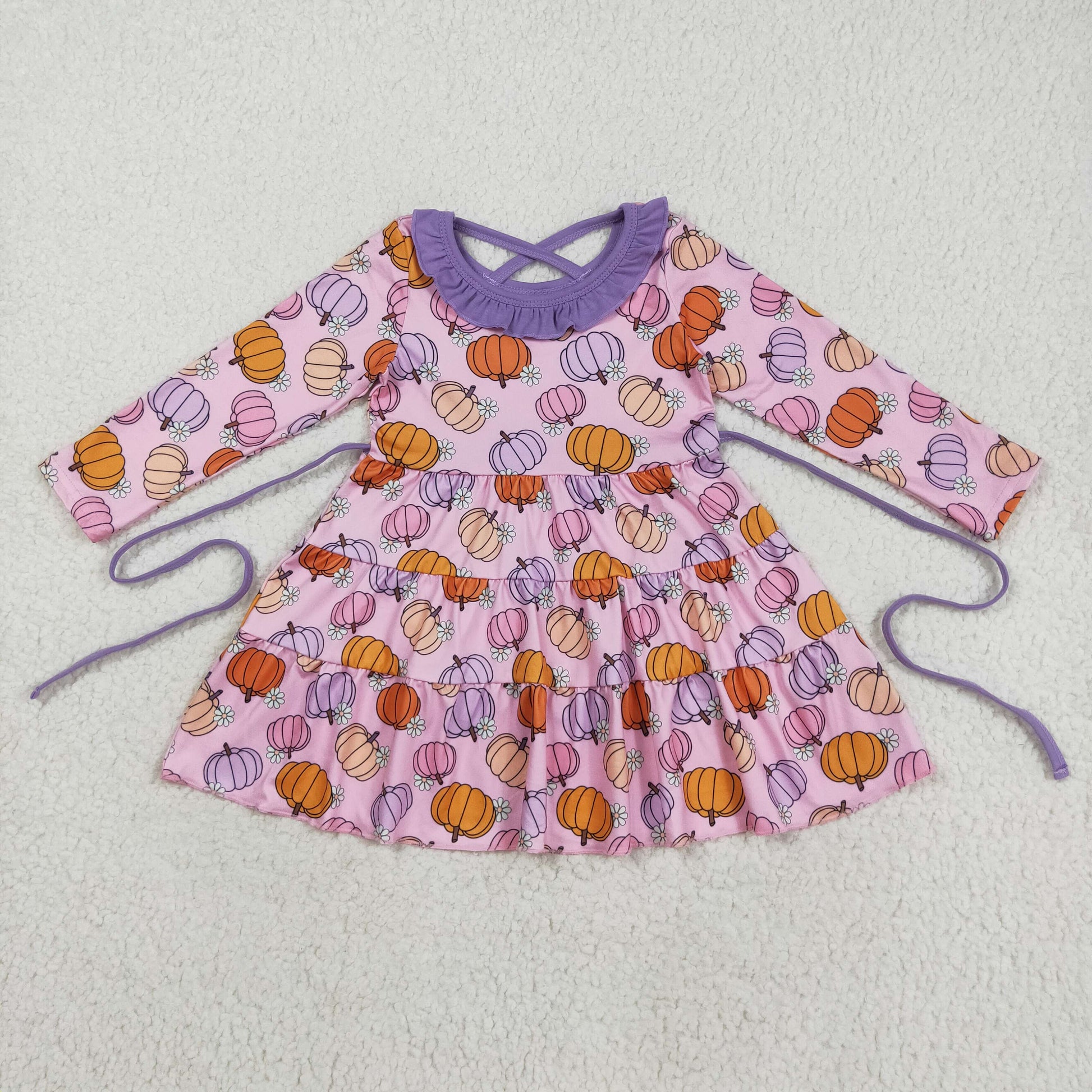 8.22 RTS NO MOQ (In stock)GLD1032 Baby Girls Winter Dress Baby Girls Pink Flowers Pumpkins Fall Knee Length Dresses With Belt