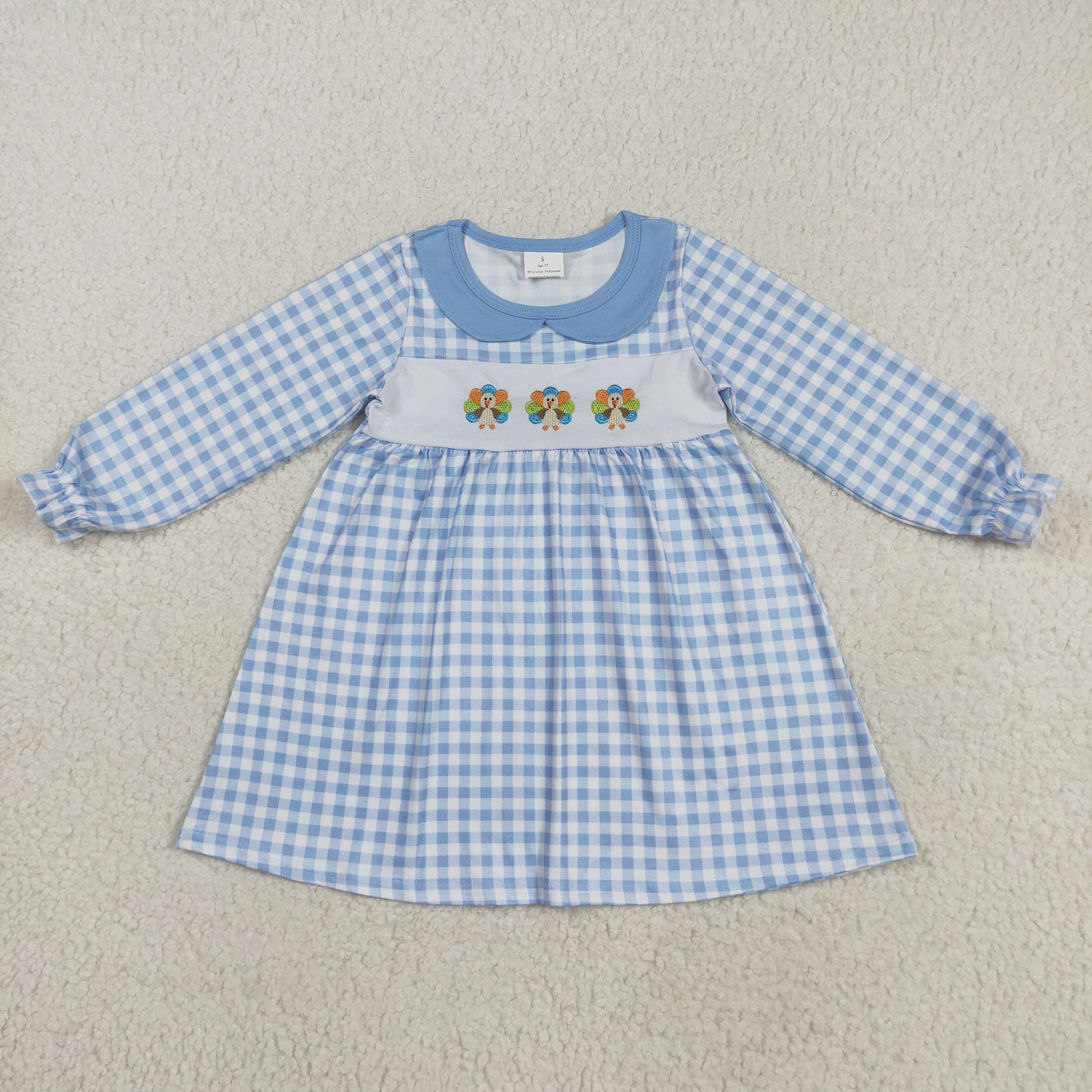 8.25 RTS NO MOQ (In stock)GLD1070 Baby Girls Winter Dress Embroidery Baby Girls Blue Checkered Thanksgiving Turkey Ruffle Knee Length Dress