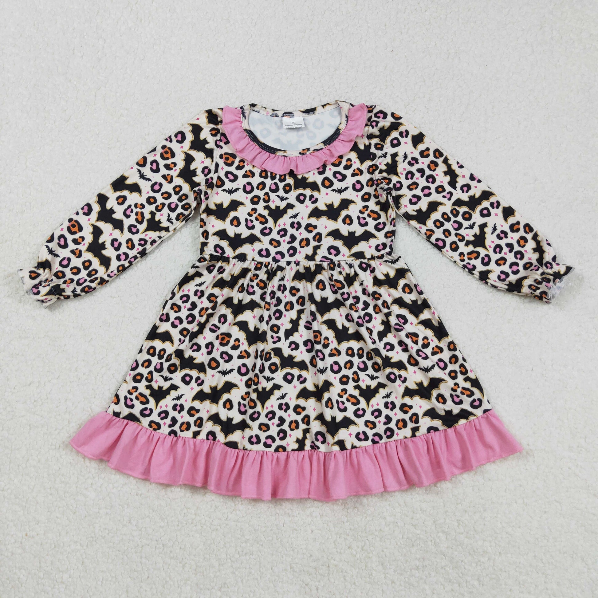 RTS NO MOQ (In stock)GLD1224 Baby Girls Winter Dress Halloween Leopard Bats Knee-Length Dress