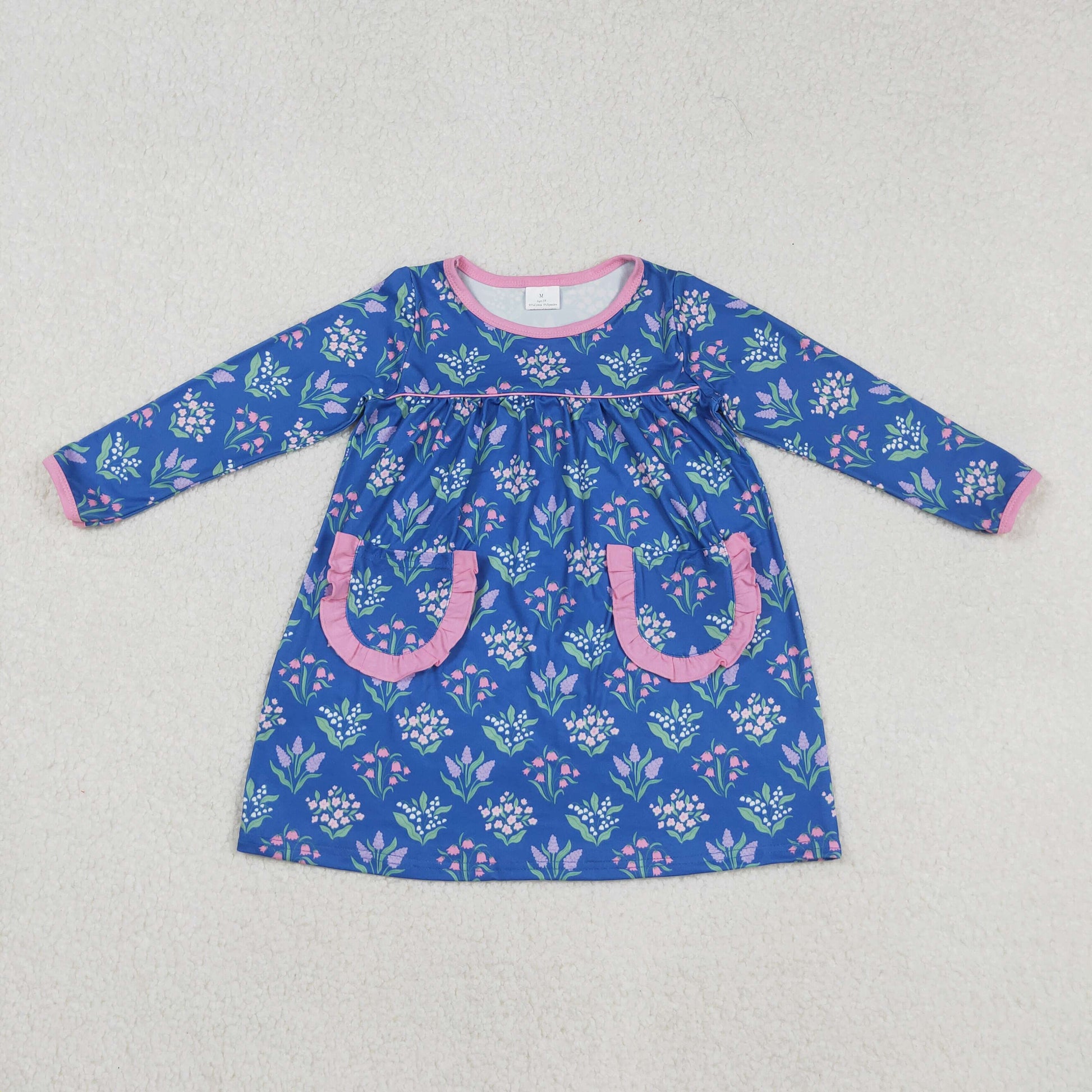RTS NO MOQ (In stock)GLD1257 Baby Girls Winter Dress Knee-Length Dress with Blue Flowers And Pockets Cute Child's Fashion Outfit