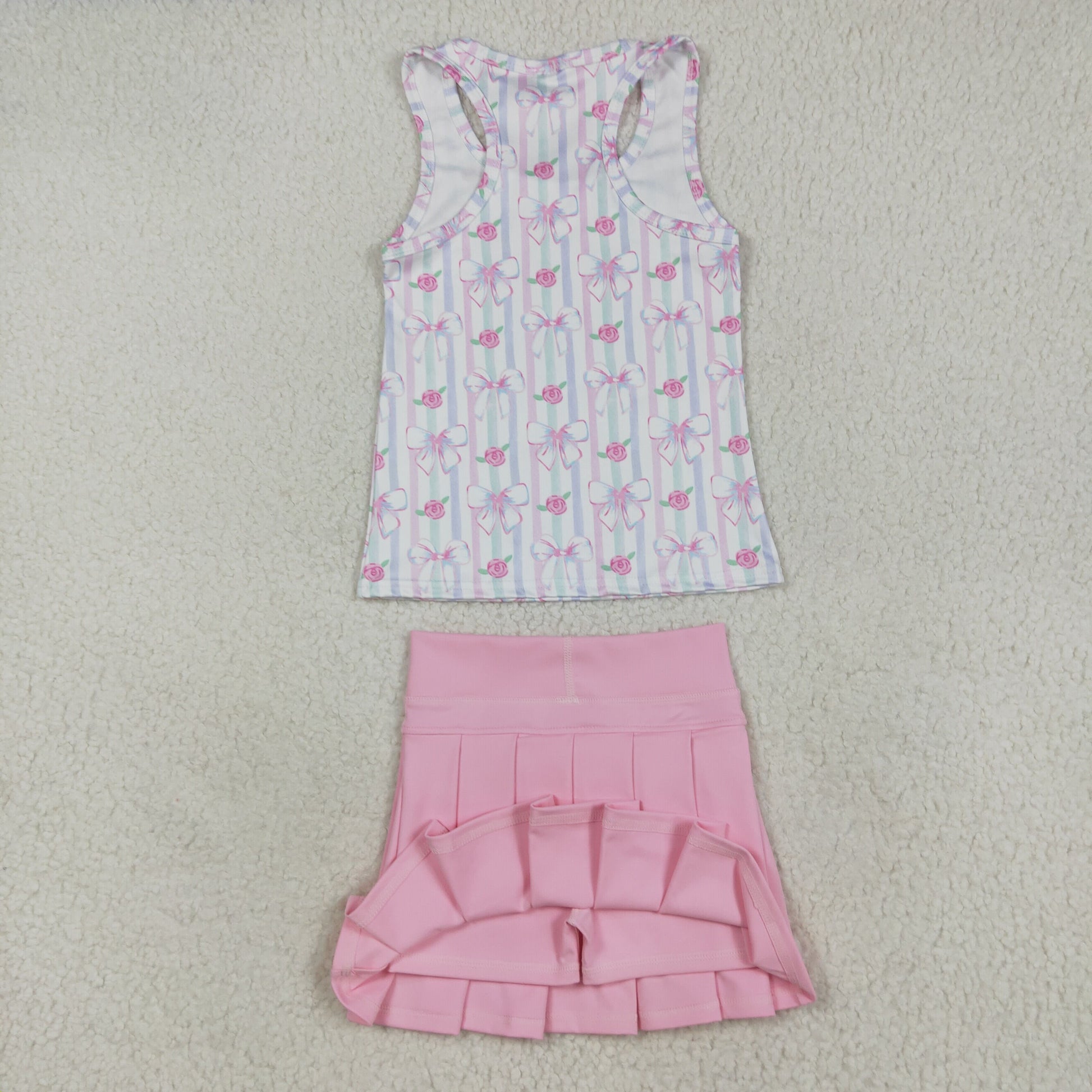 RTS NO MOQ (In stock)GLK0088+GT1014 Baby Girls Summer Outfits Baby Girls Sleeveless Lavender Bows Flowers Stripe Yoga Shirts Tops Baby Girls Light Pink Yoga Active Wear Pleated Skirts