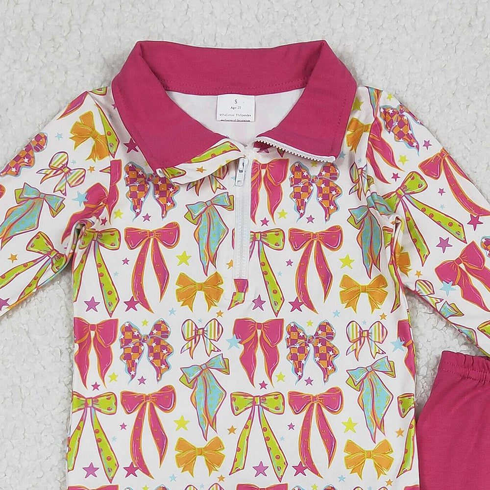 RTS NO MOQ (In stock)GLP2616 Baby Girls Winter Outfits Long Ruffle Sleeves Pink Bows Stars Zipper Top Legging Pants Sets