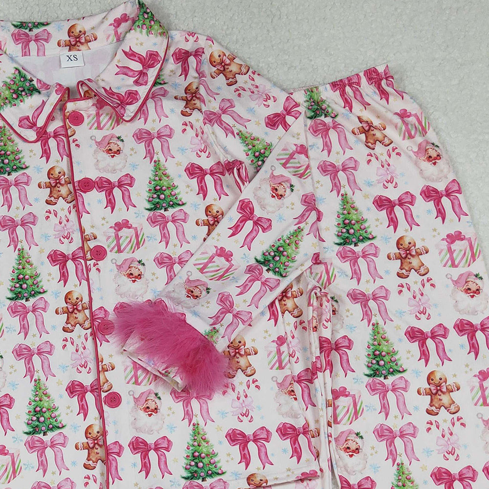 RTS NO MOQ (In stock)GLP2717 Adult women's pajamas set Bows Gingerbread Trees Button Top Pants Christmas Fur Pajamas Sets