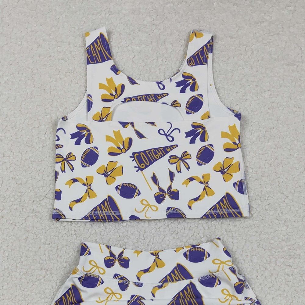 RTS NO MOQ (In stock)GSD2690 Baby Girls Yoga Sets Baby Girls Purple Footballs Bows Plaid Vest Top Skorts Team Yoga Active Set