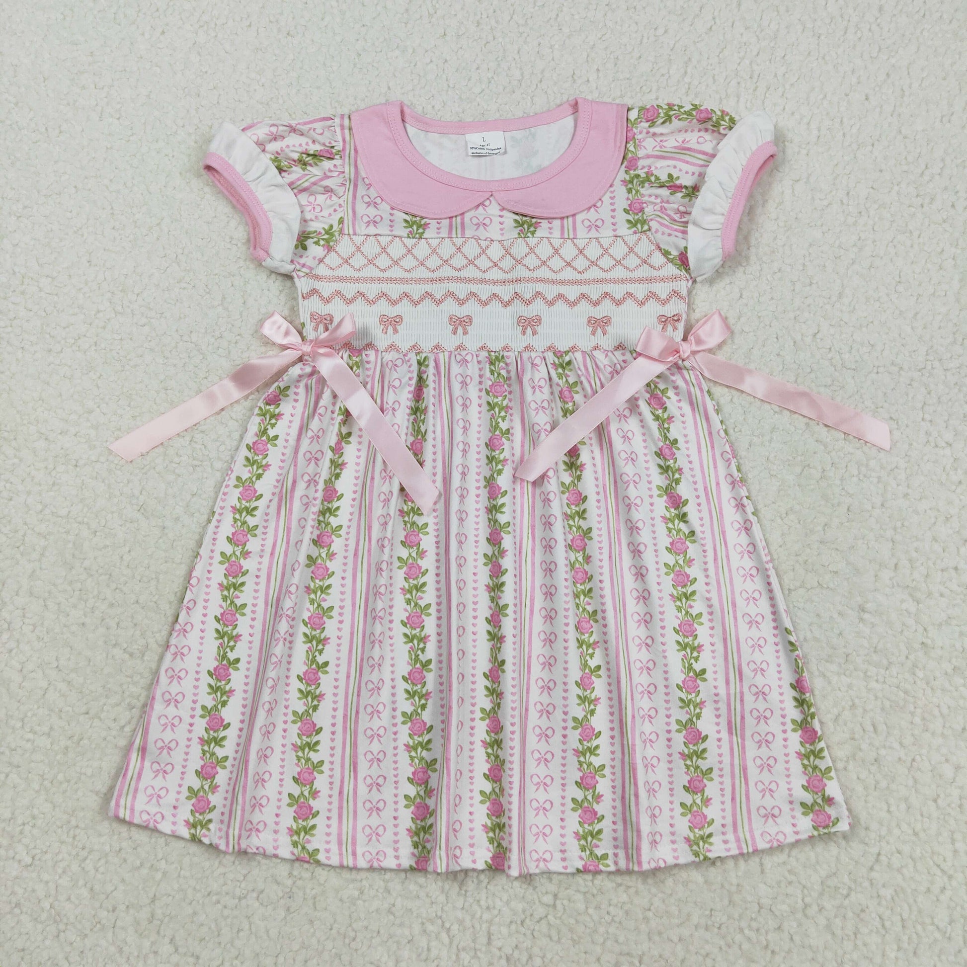 RTS NO MOQ (In stock)GSD2717 Baby Girls Summer Dress Smocked Embroidery Bows Baby Girls Flowers Stripe Knee Length Dresses