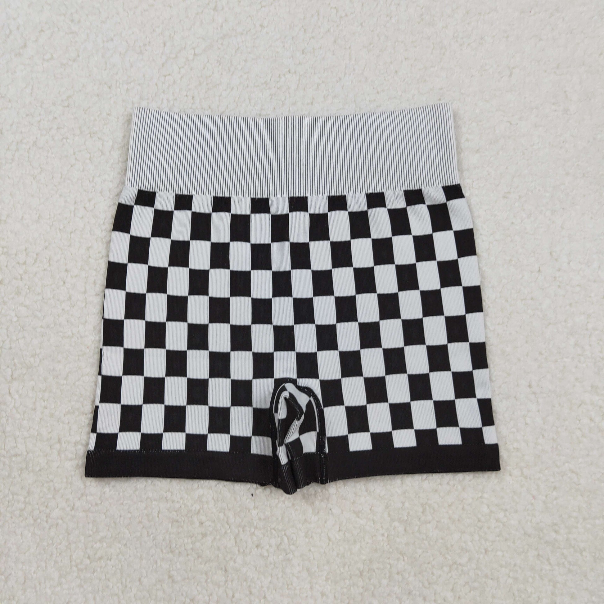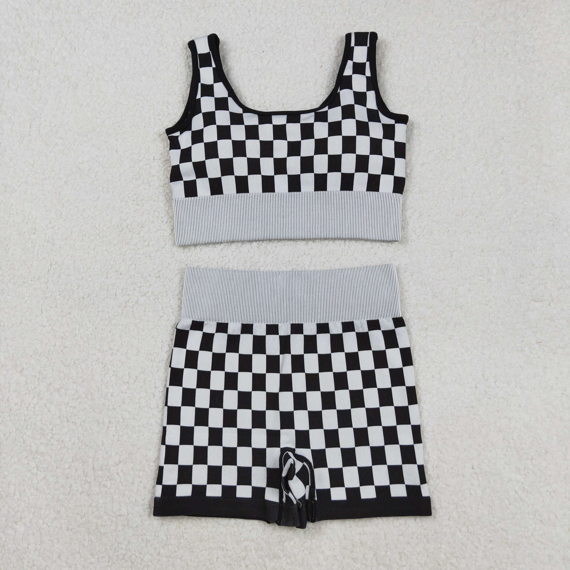 RTS NO MOQ (In stock)GT1189+SS0644 Adult Women's Yoga Outfits Black Checkered Knitted Yoga Crop Top High Waist Bottoms Set