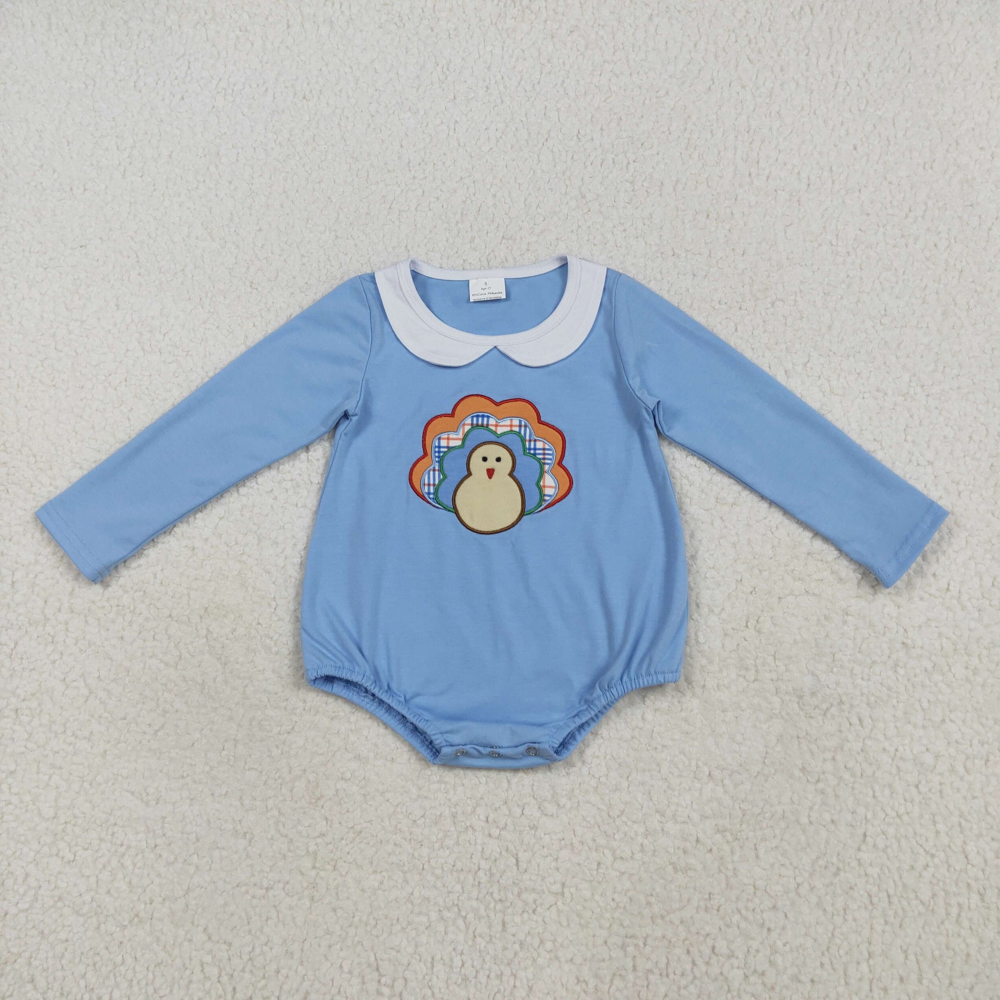 RTS NO MOQ (In stock)LR2261 Baby Boys Winter Rompers Embroidery Baby Boys Blue Long Sleeves Turkey Bummies Rompers