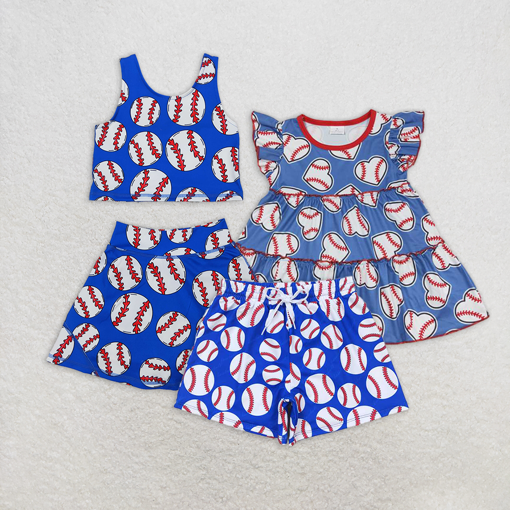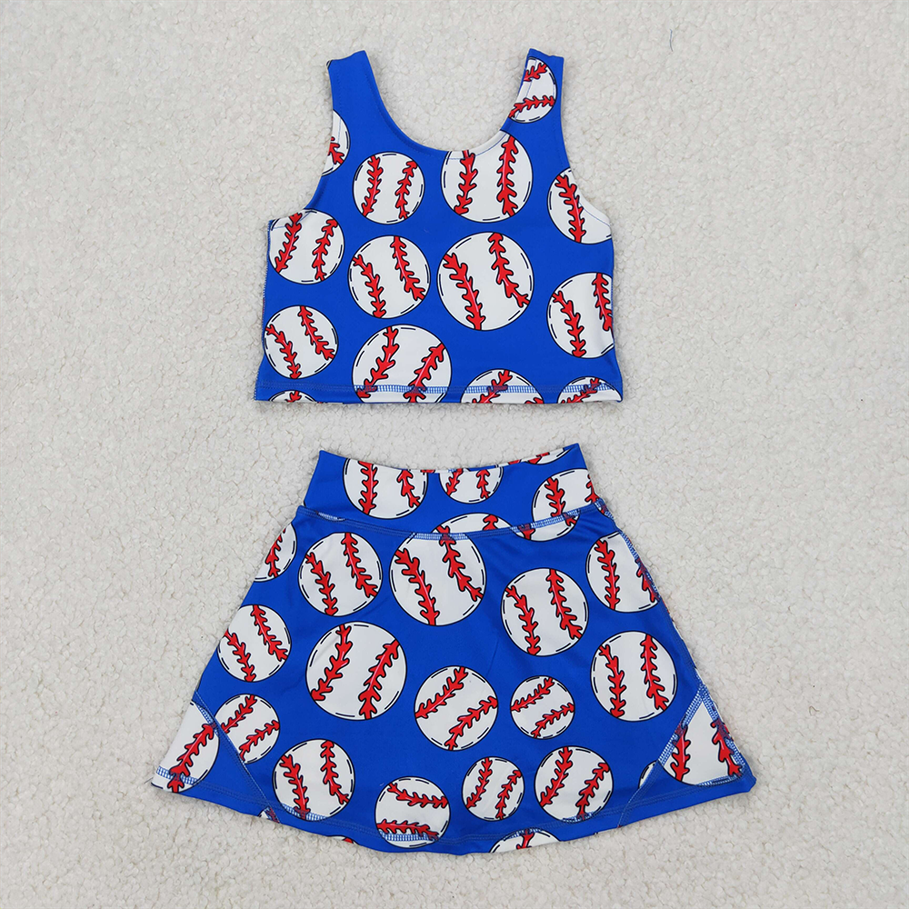 5.28 RTS NO MOQ Baby Girls Summer Yoga Outfits Sleeveless blue baseball top skirt girls activewear clothing set