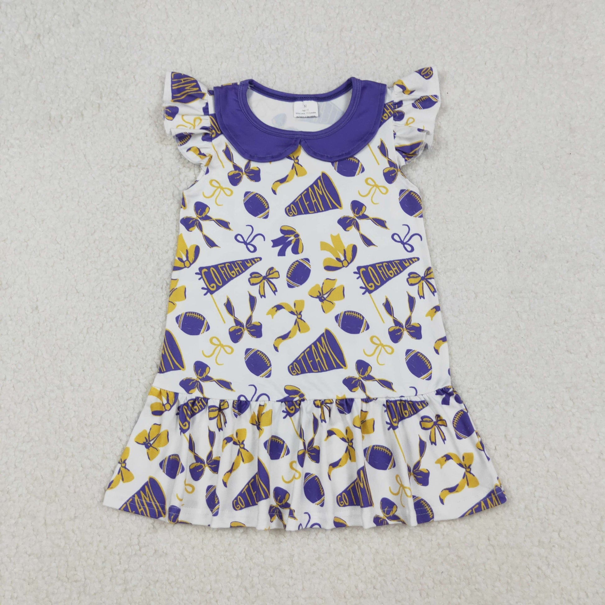 RTS Sibling Kids Girls Football Theme Dress with Flutter Sleeves And Blue/Purple Bow 'Go Team' Design for Children's Apparel