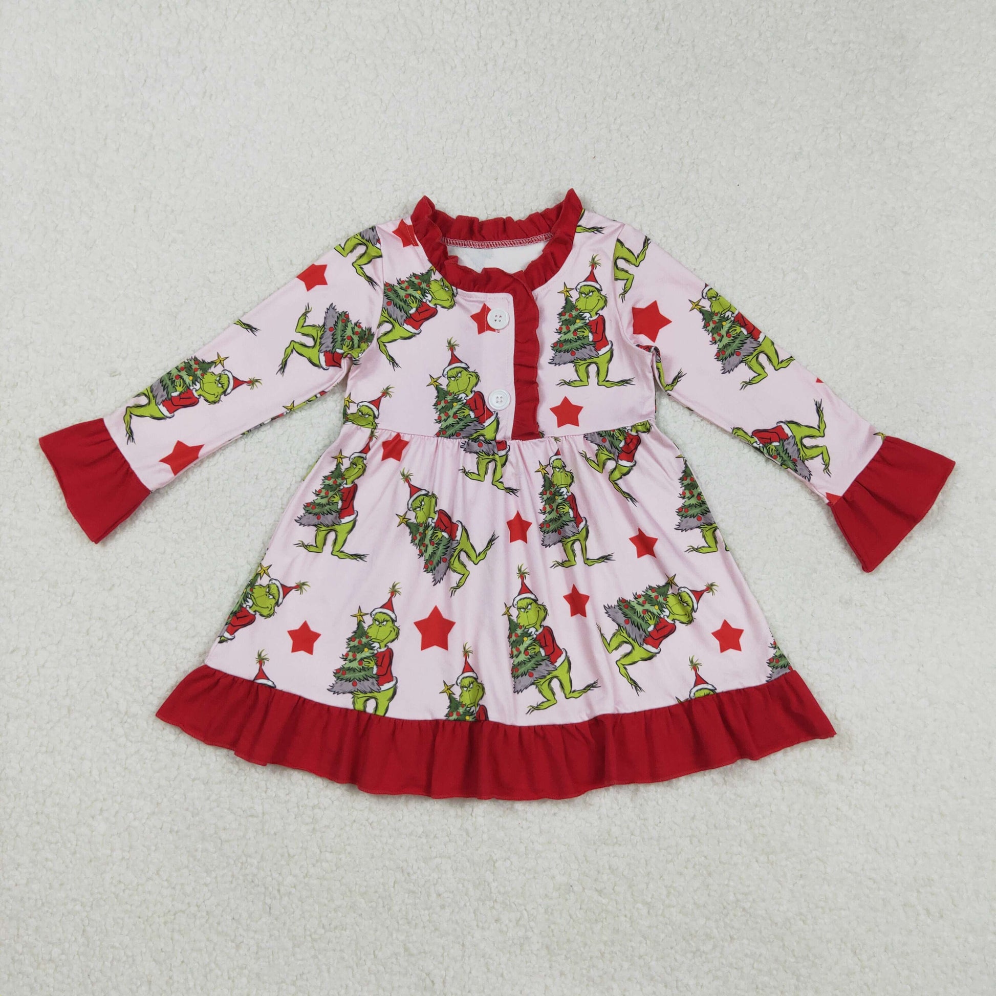 RTS Sibling Baby Girls Winter Outfits Green Face Christmas Pajamas Long Sleeves Ruffle Stars Design Rompers Dress Cute Holiday Sleepwear for Kids