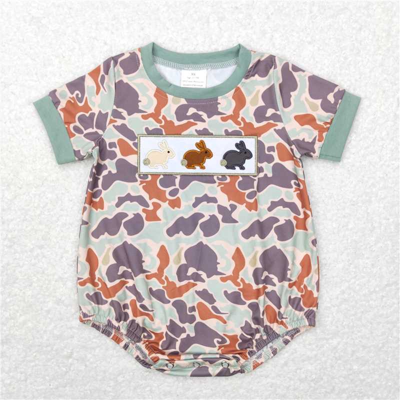 SR0508 Embroidery Baby Infant Boys Short Sleeve Easter Camo Rabbits Rompers