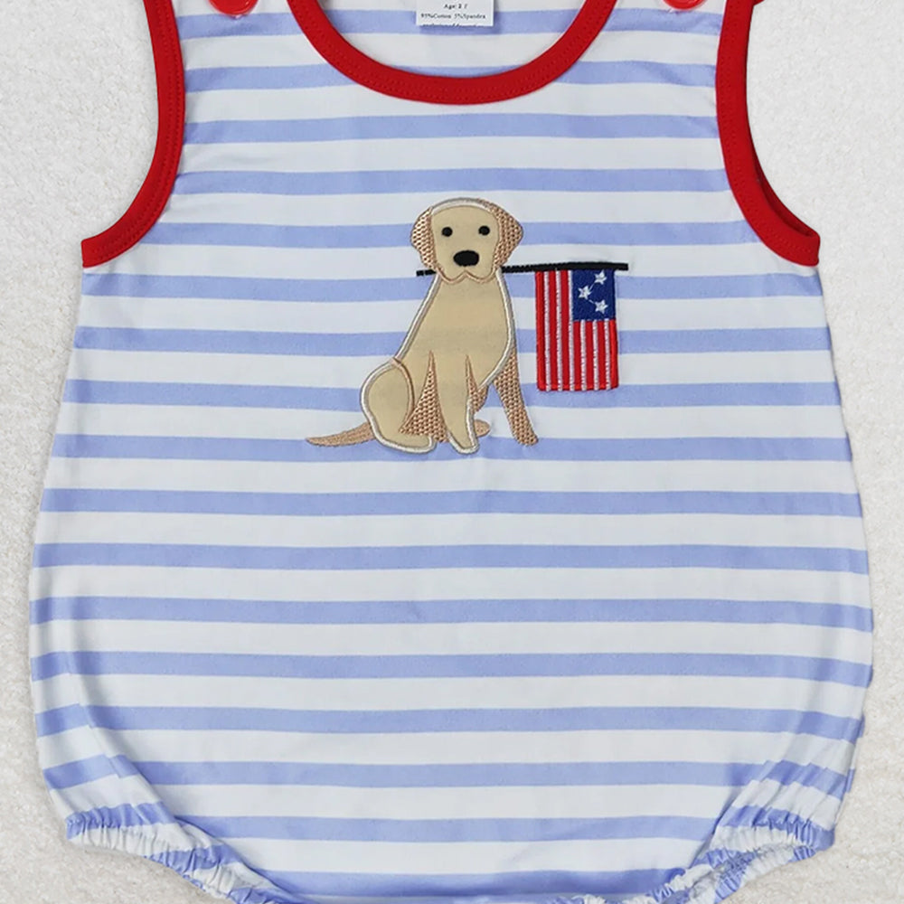 SR1080 RTS NO MOQ Baby Boys Summer Rompers Embroidery Baby Infant Boys Blue Stripes Dog Flag Sleeveless Summer Rompers