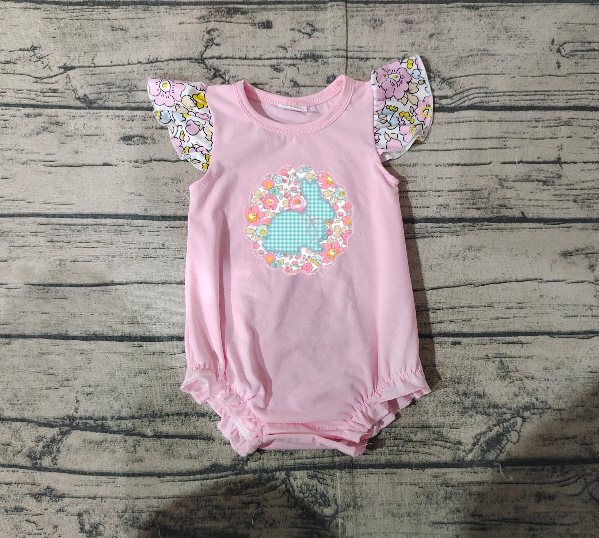 SR2054Pink Floral Bunny Baby Girls Easter Romper with Flutter Sleeves Soft Cotton Outfit for Little Girls Cute Spring Photography Props