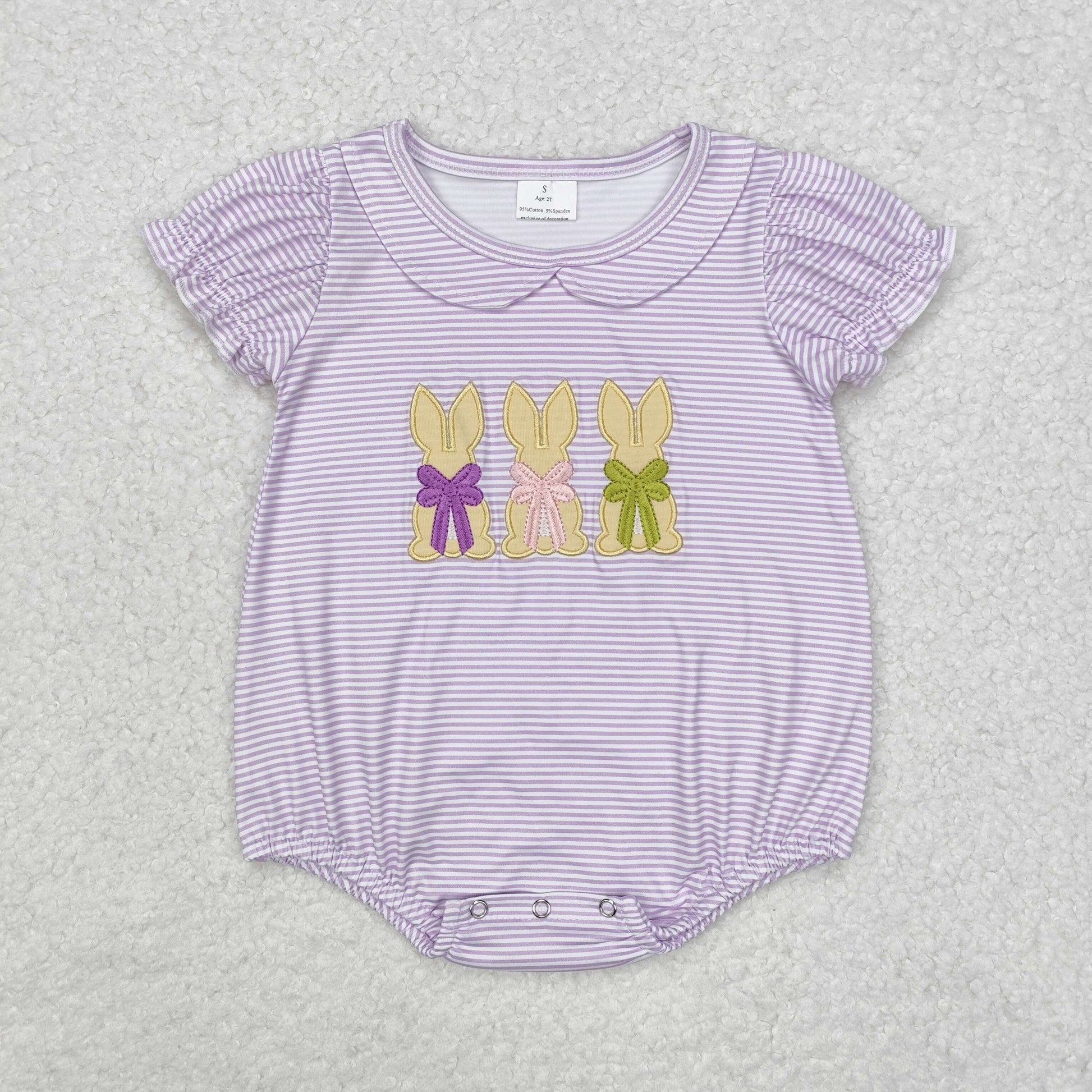 SR2074 Embroidery Lavender stripe flutter sleeves bunny baby girls Easter romper