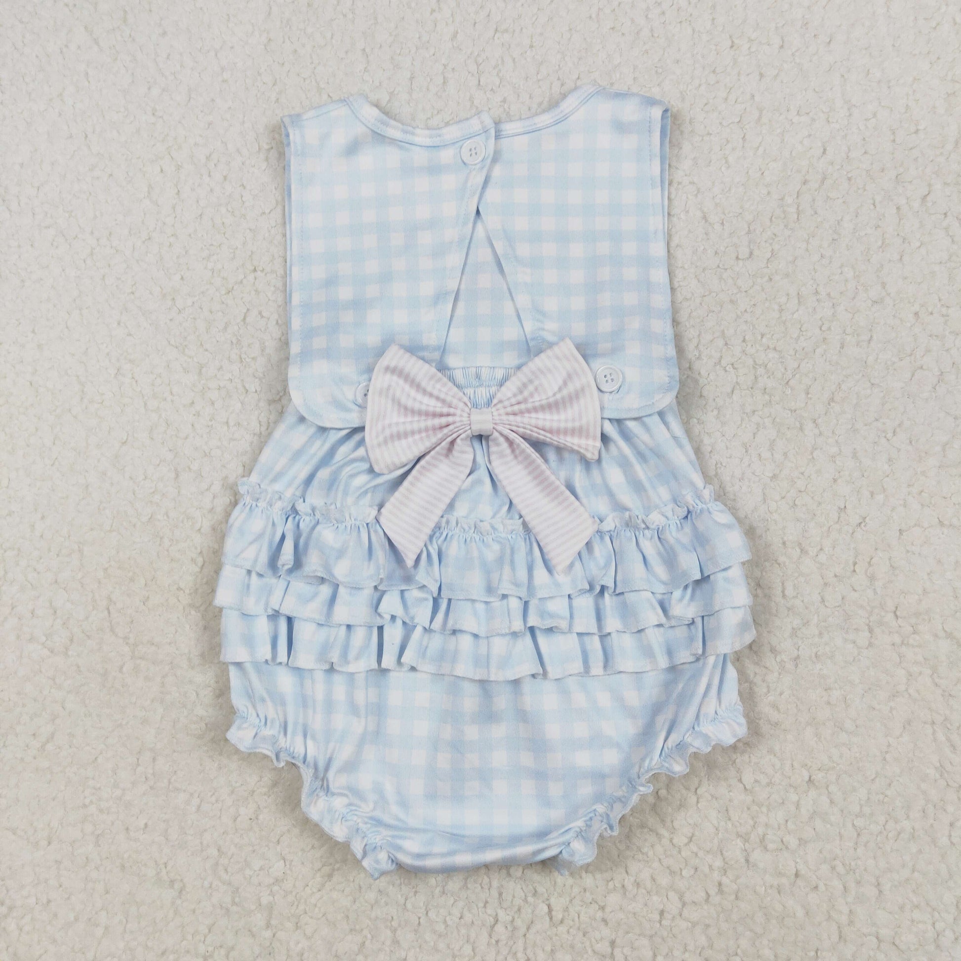 SR2203Baby Infant Girls Blue Checkered Bows Sleeveless Rompers