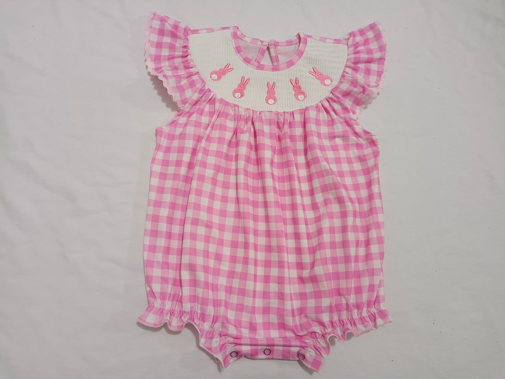 SR2215 Embroidery Baby Infant Girls Easter Rabbits Checkered Smocked Rompers preorder