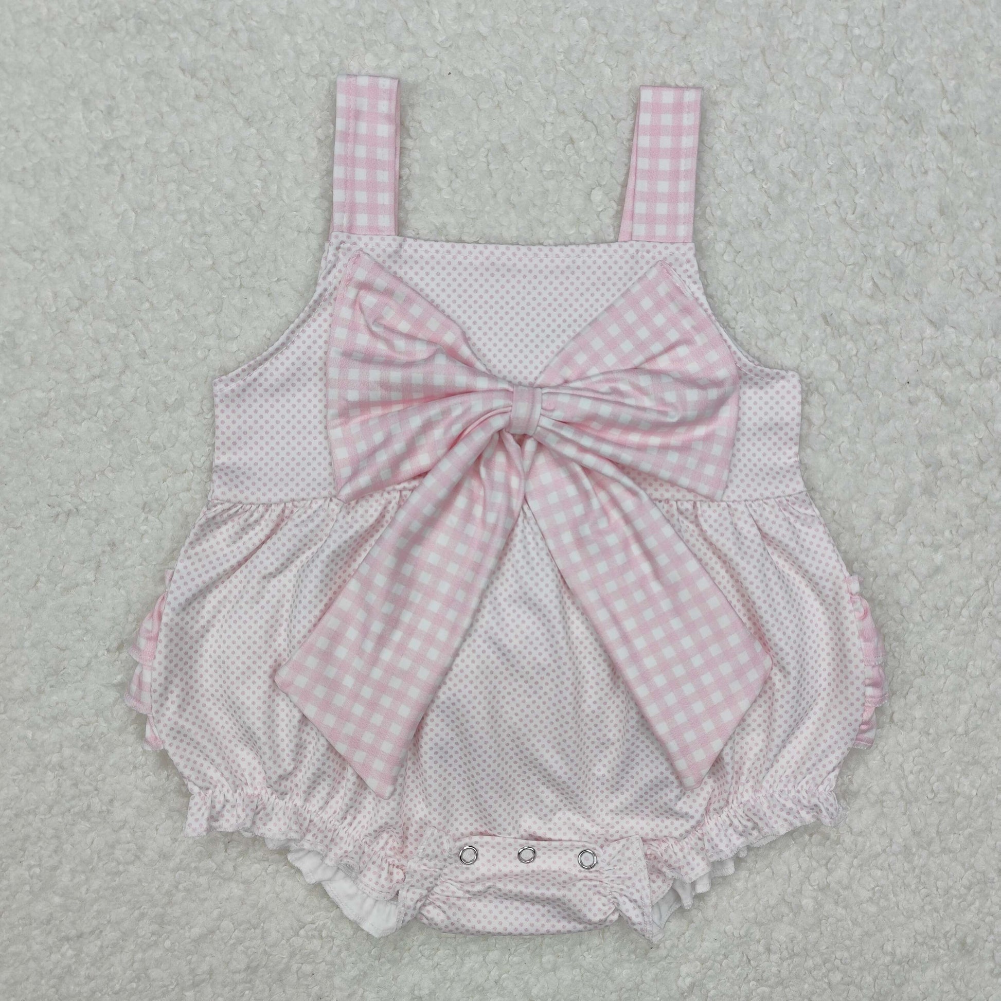 SR2280 Pink plaid bow polka dots baby girls ruffle romper