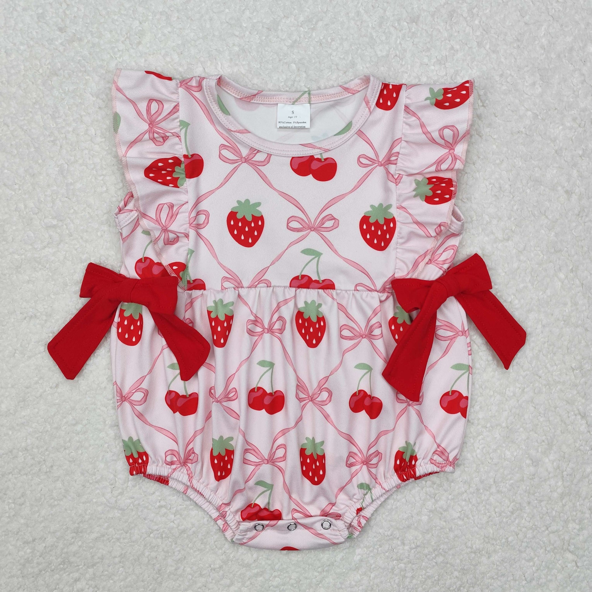 SR2295Ruffle pink bow strawberry cherry baby girls romper