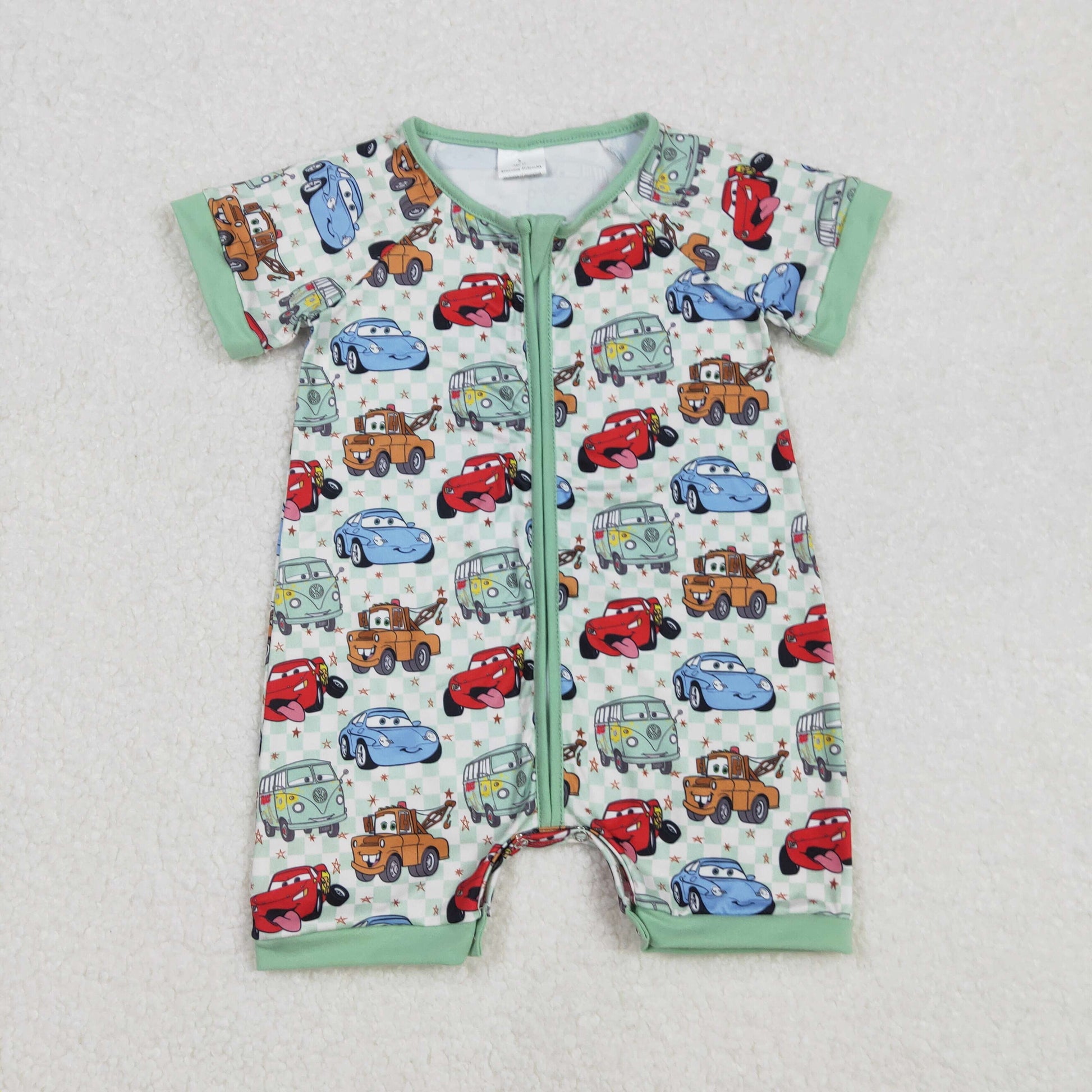SR2373Plaid Cars Baby Kids Zipper Romper Short Sleeves Comfortable Clothing for Infants