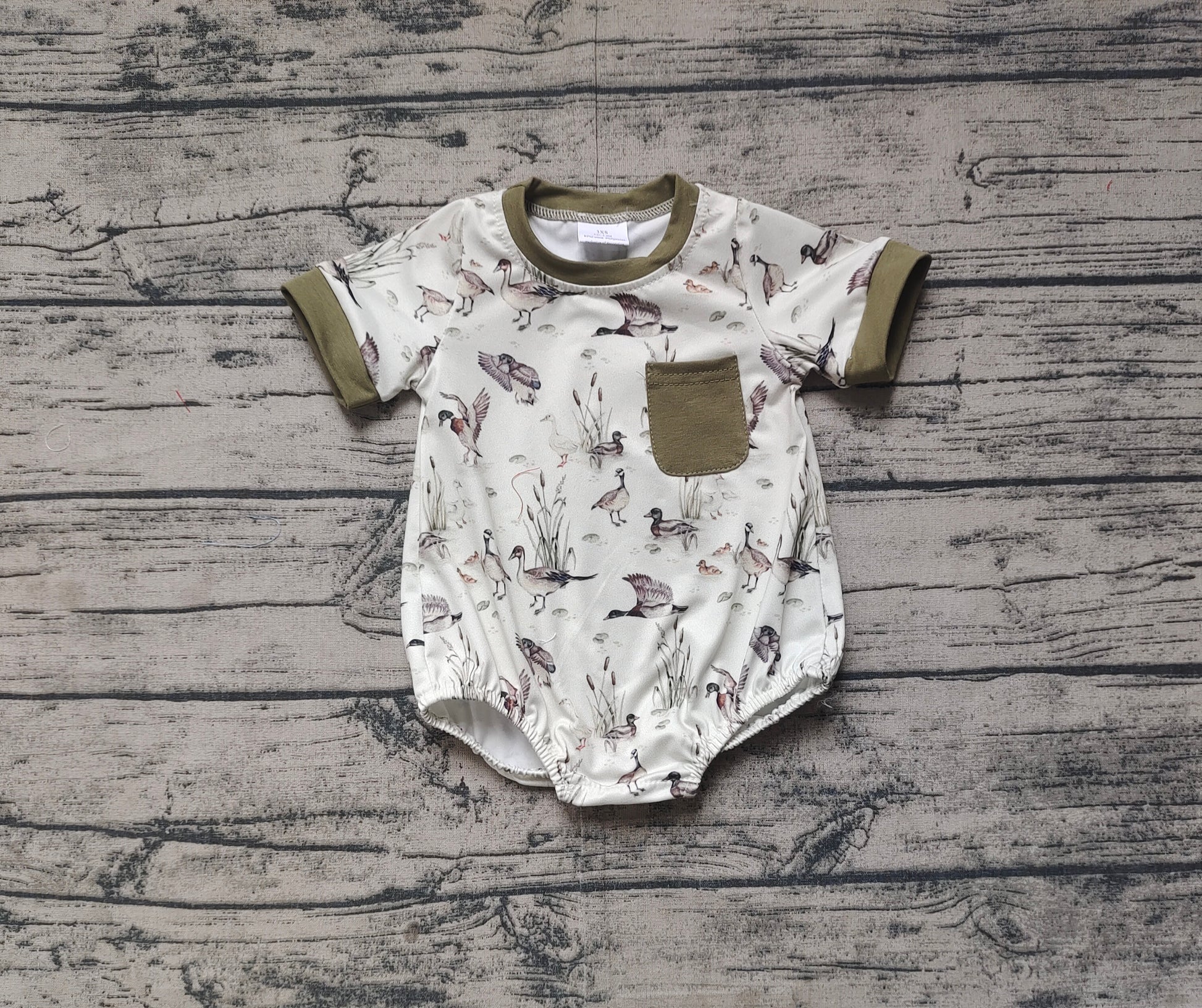 SR2413Baby Boy Summer Romper Olive Pocket Duck Design Comfortable Lightweight Clothes for Infants