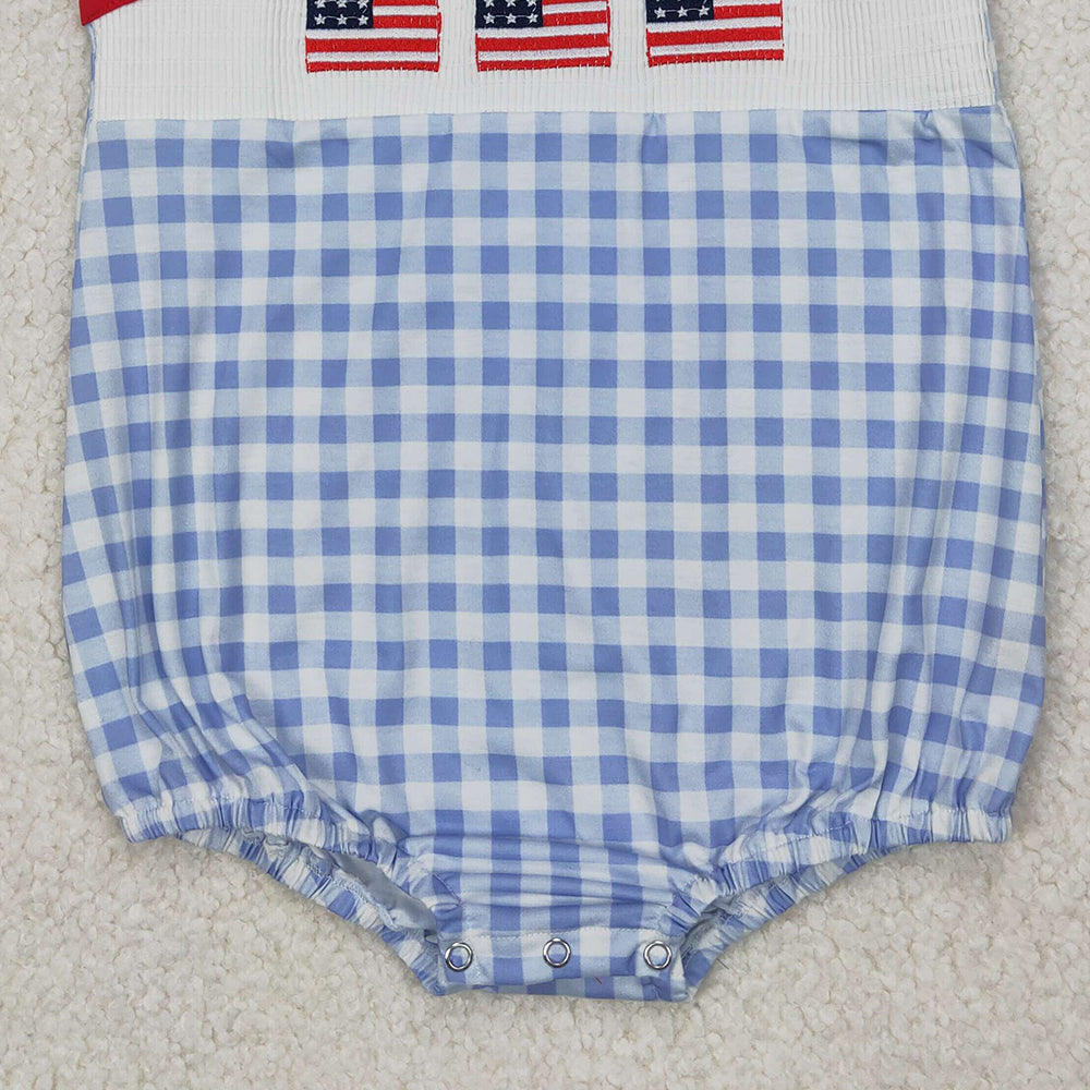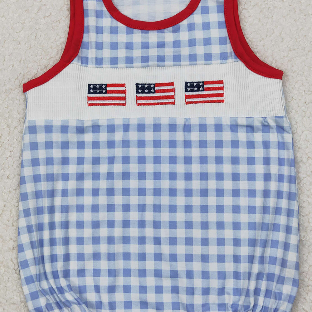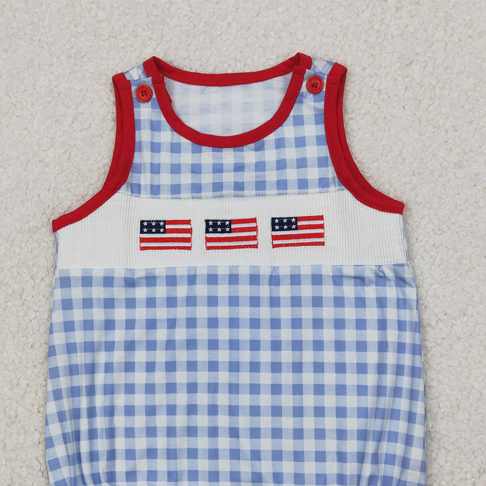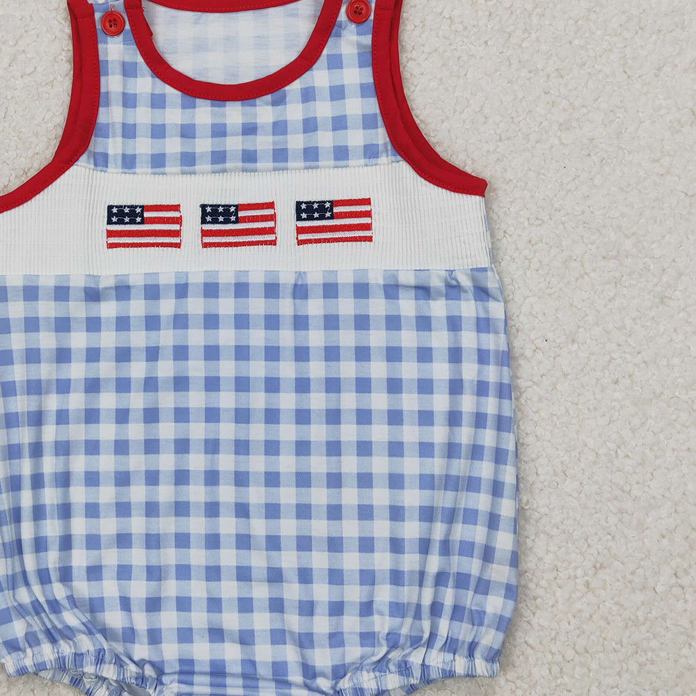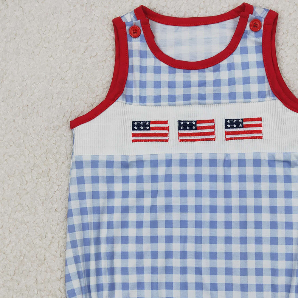 4.10 SR2572 RTS NO MOQ Baby Boys Summer Romper Baby Boys Gray Plaid Sleeveless Flags 4th Of July Smocked Romper