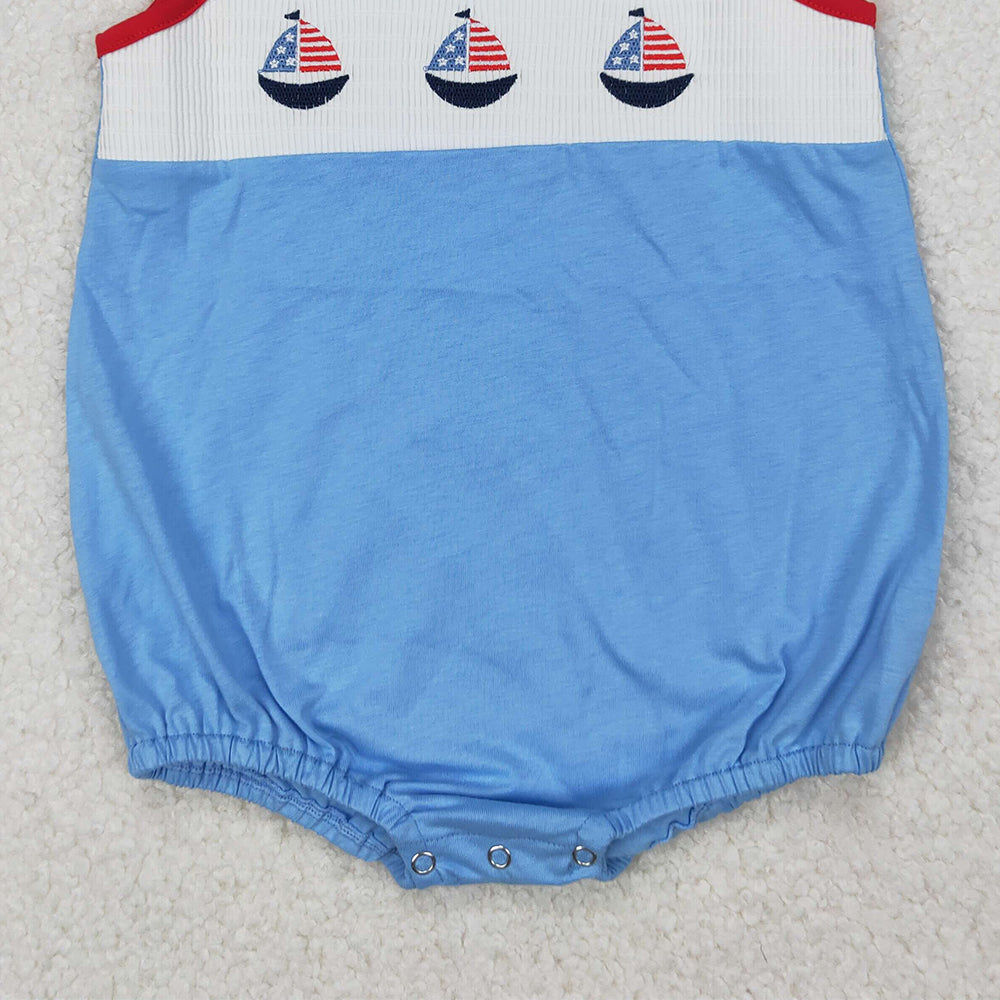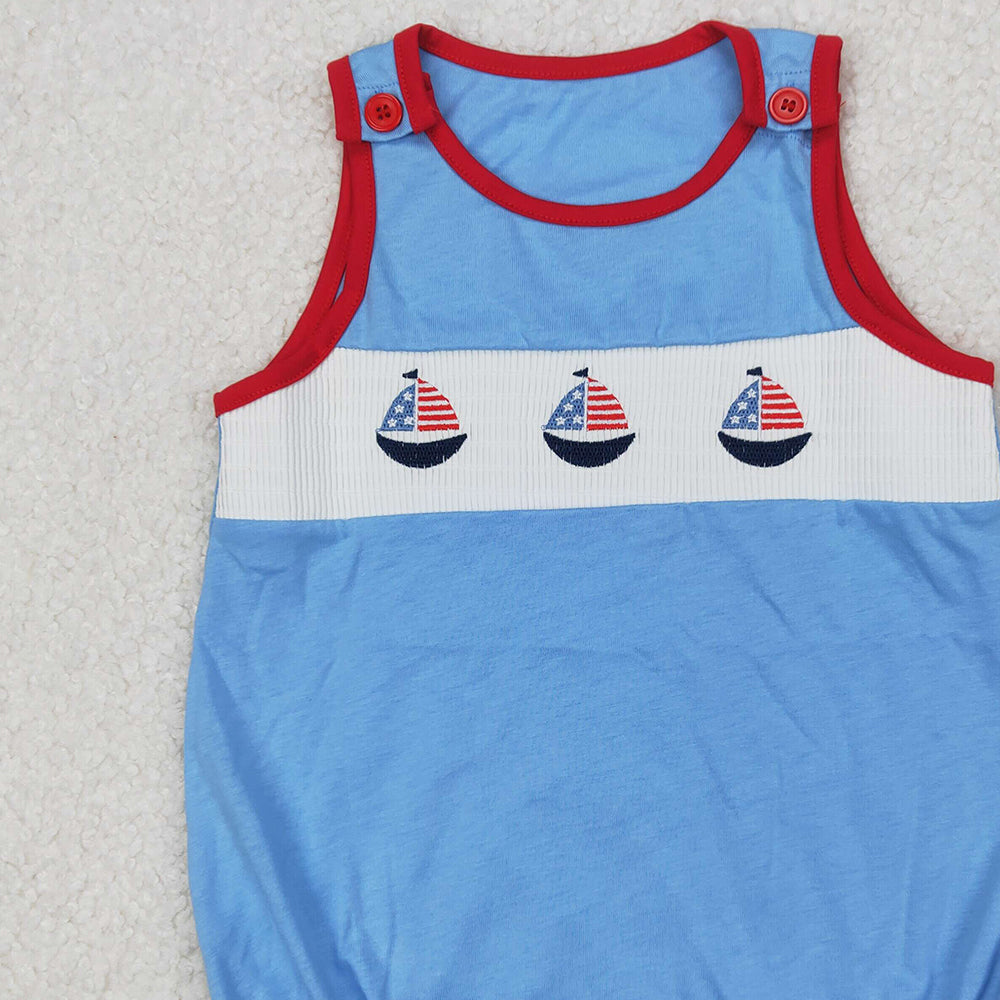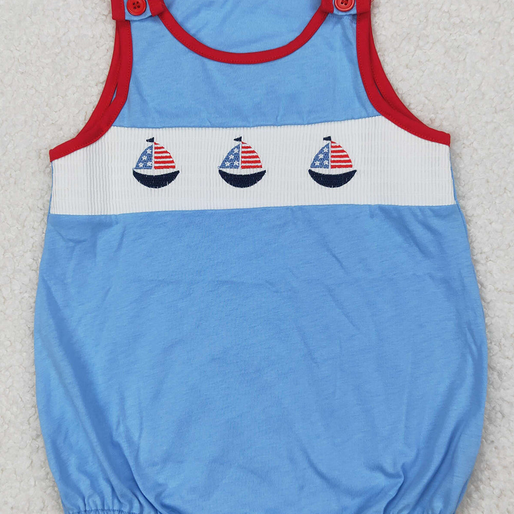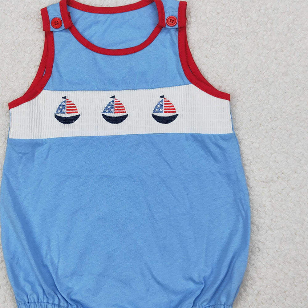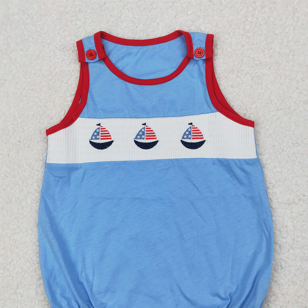 4.10 SR2574 RTS NO MOQ Baby Boys Summer Romper Baby Boys Blue Sleeveless Flag Boats 4th Of July Smocked Romper