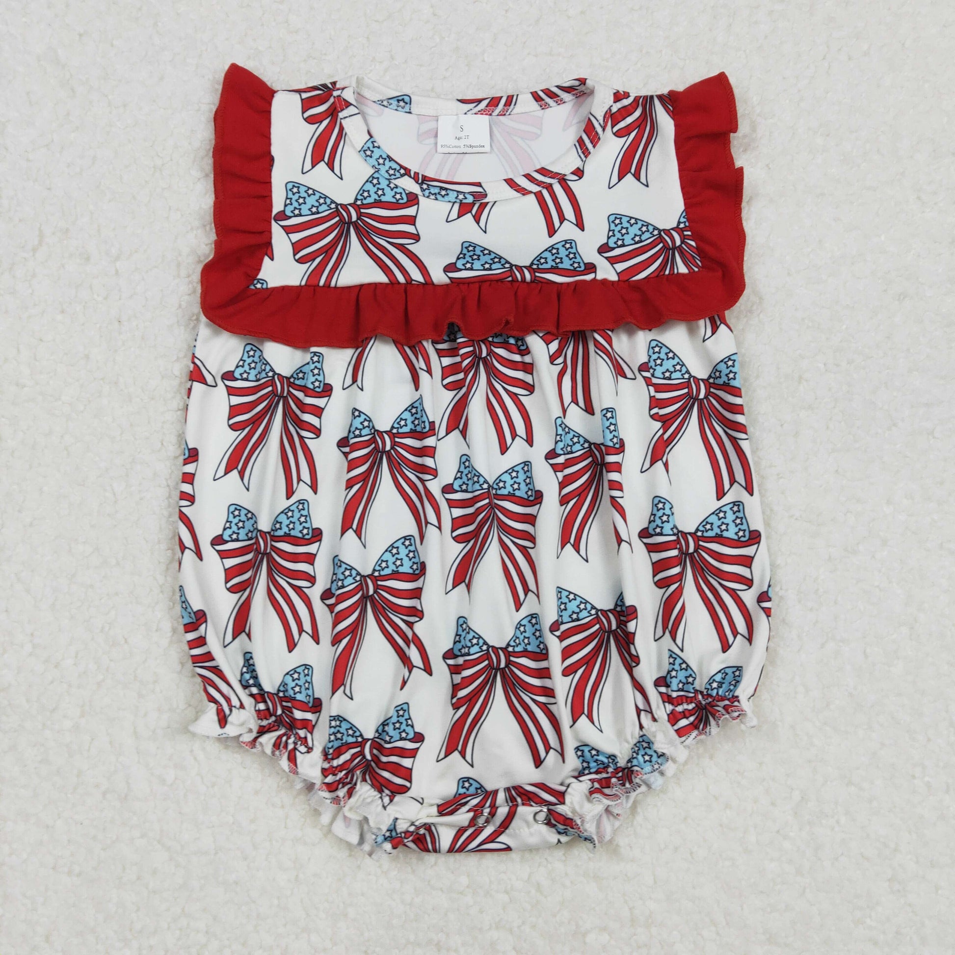 SR2664RTS NO MOQ Baby Girls Summer Rompers Red Ruffle Stars And Stripes Bow Baby Girls 4th of July Romper Cute Patriotic Outfit for Little Ones