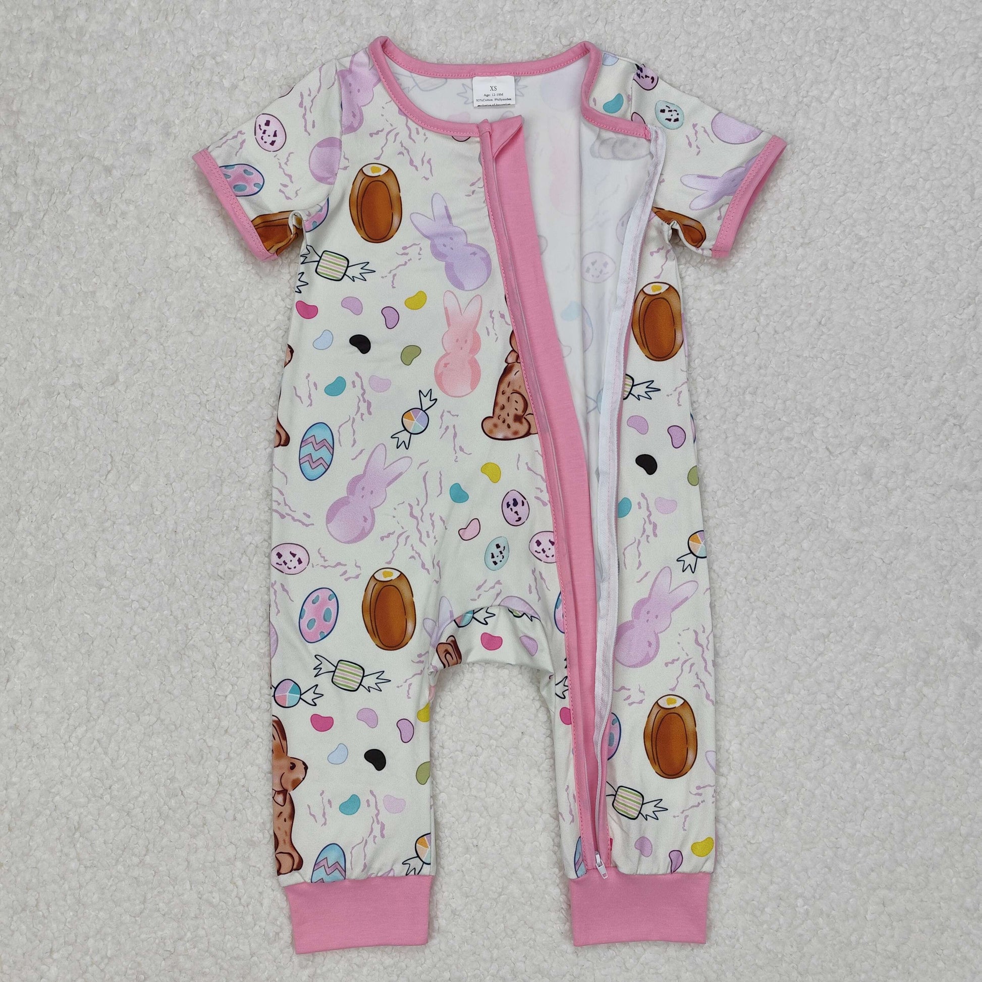 SR2712Pink Zip Romper Short Sleeves for Baby Girls Easter Themed Rabbit Design Baby Girl's Outfit Pink Rompers for Spring