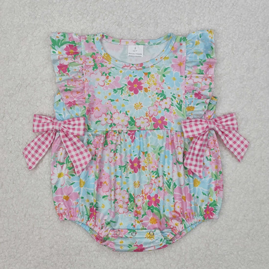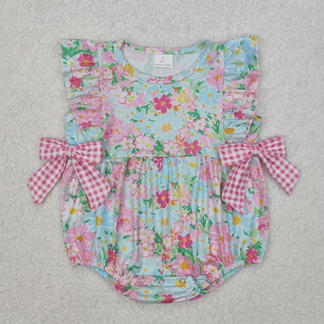 SR2719Baby Girls Ruffle Floral Pink Plaid Bow Summer Romper Cute Infant Outfit with Bow Detailing for Little Girls
