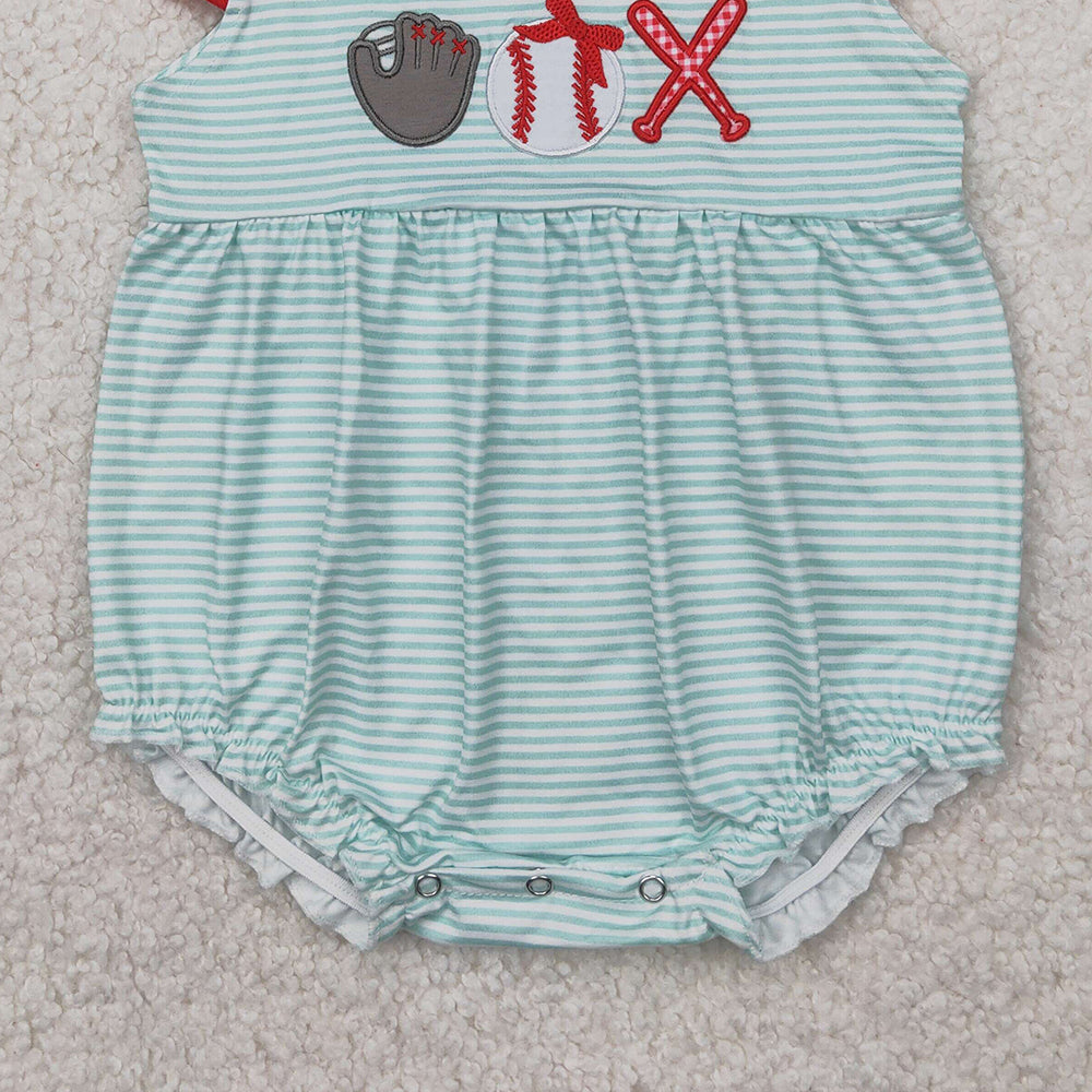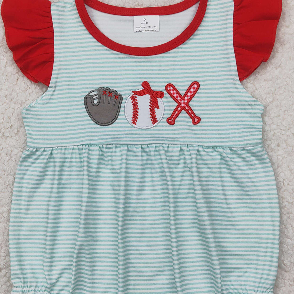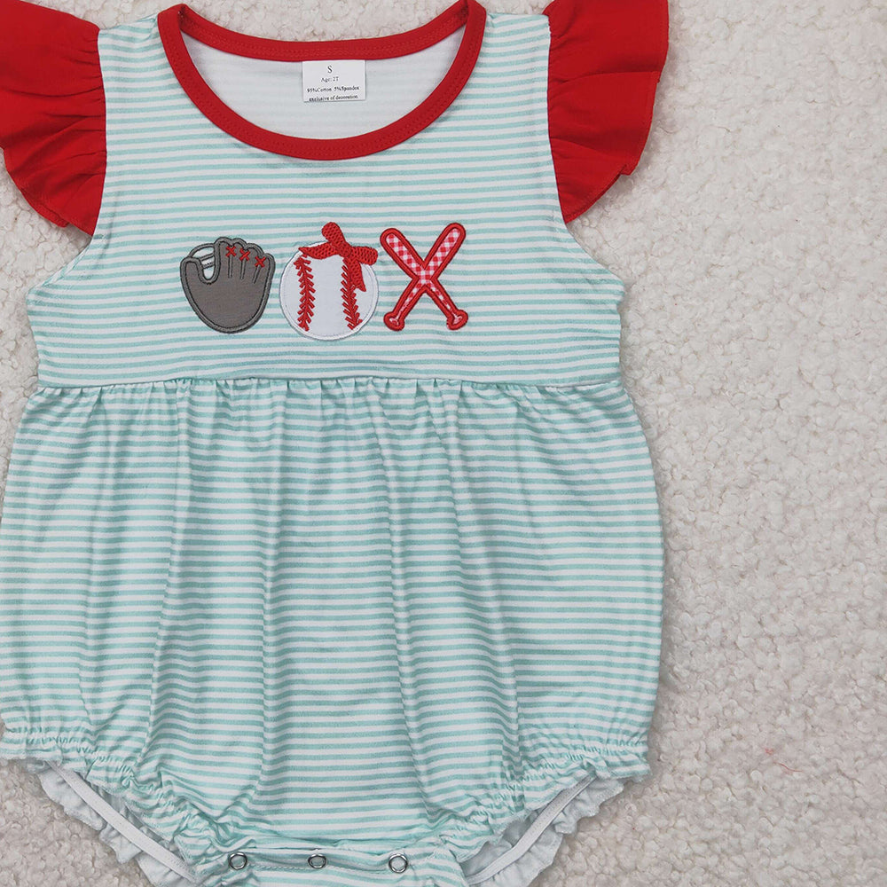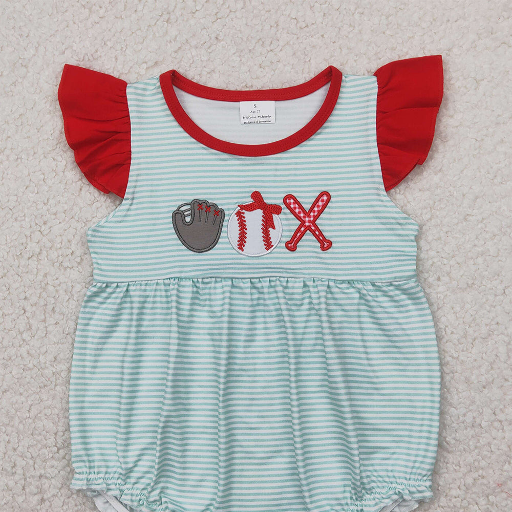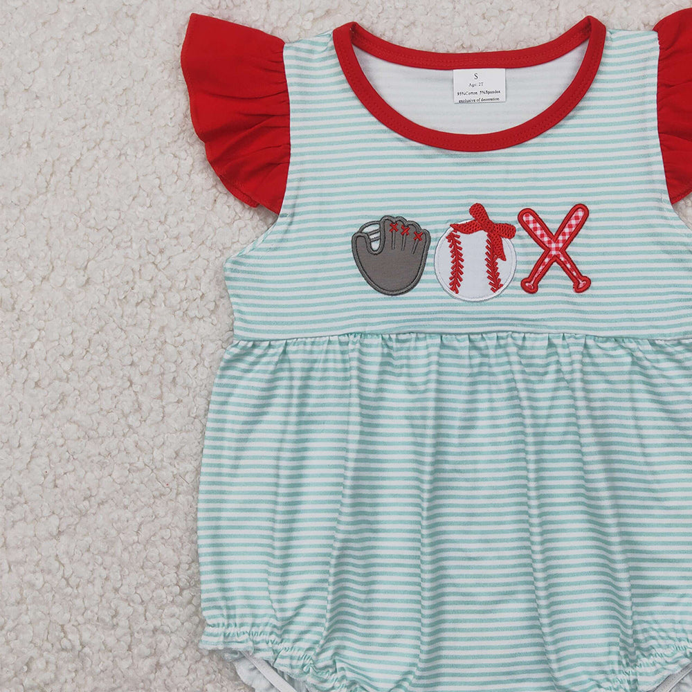 SR2892RTS NO MOQ Baby Girls Summer Rompers Baby Girls Red Flutter Sleeves Baseball Top Aqua Stripe Rompers