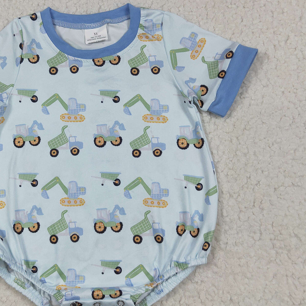 SR3142 RTS NO MOQ Baby Boys Summer Rompers Baby Boys Short Sleeves Blue Excavators Plaid Rompers