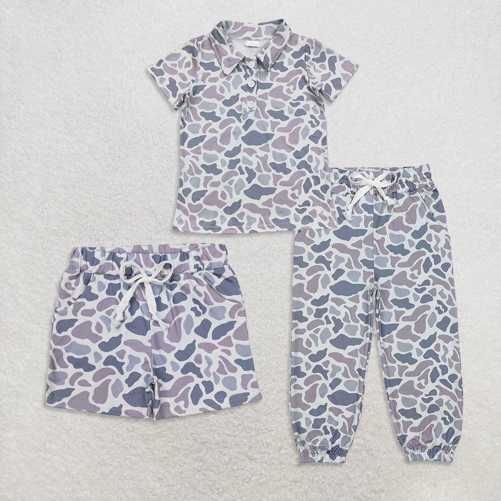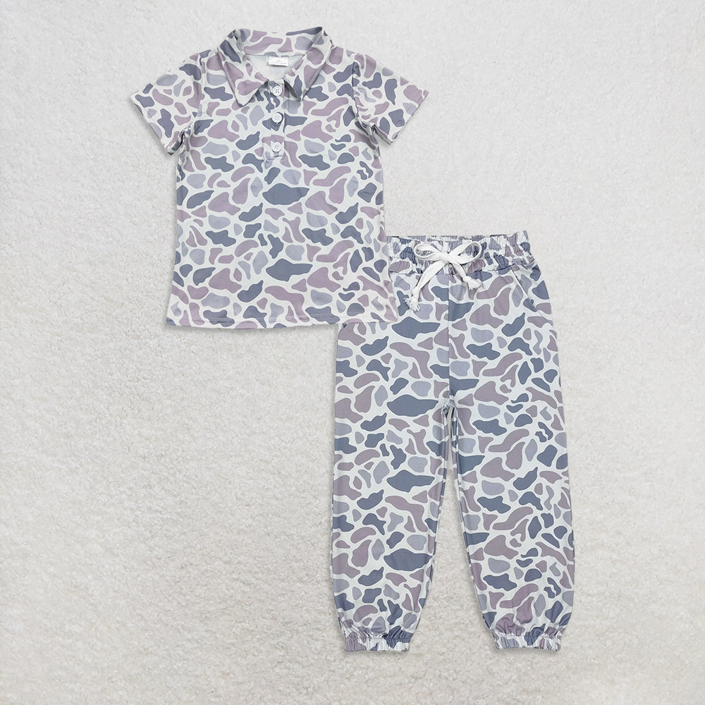 USA Warehouse (IN STOCK) Kids Boys Grey Camo Polo Shirt Short Sleeves with Pockets Elastic Waist Hunting Theme Clothing for Boys